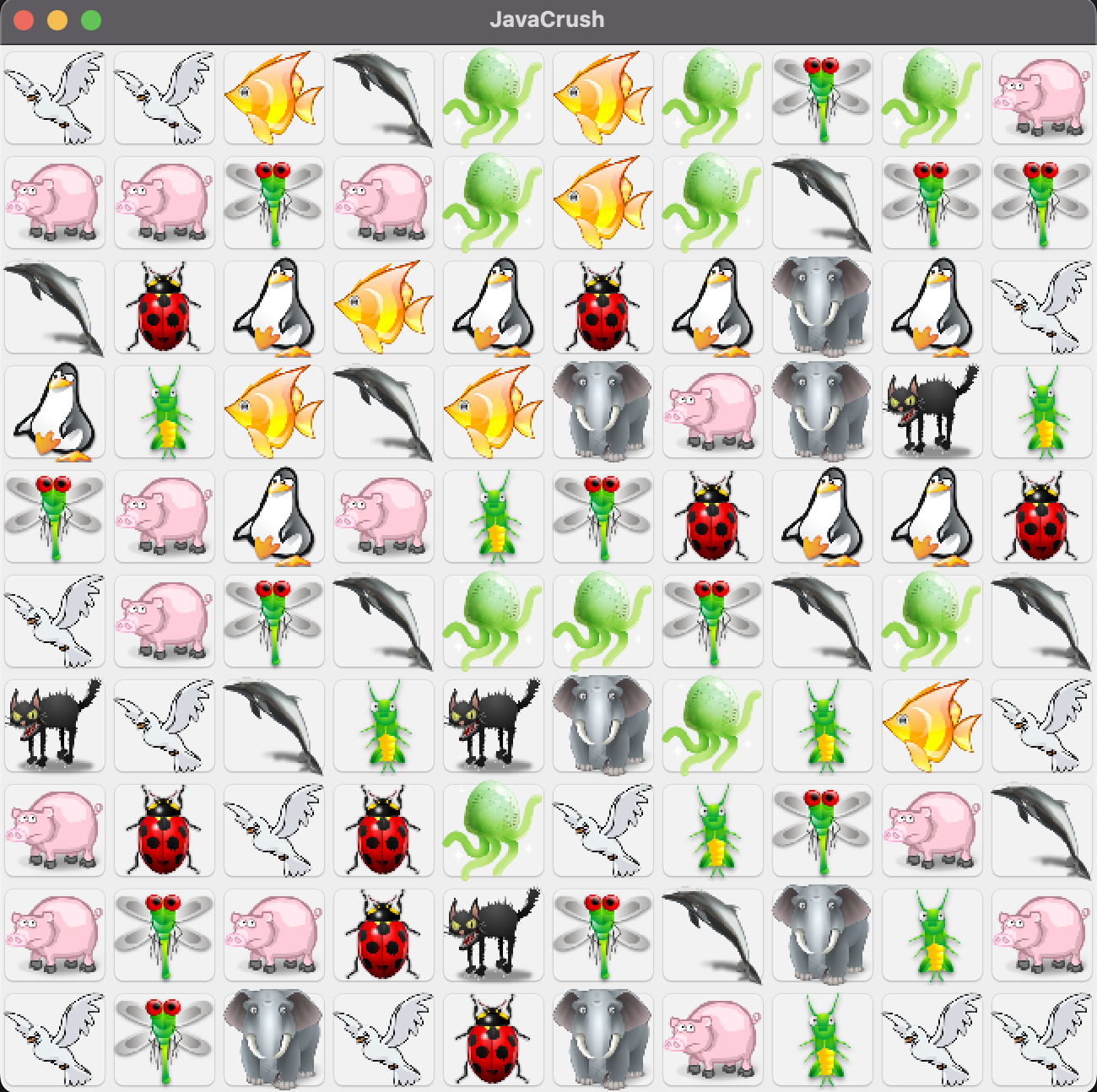 At the heart of JavaCrush lies a straightforward but engaging game mechanic. The player is presented with a grid filled with animal icons, and the goal is to align three or more identical animals, either horizontally or vertically. Once aligned, the animals disappear, and new ones are generated to replace them. The game’s randomness ensures fresh gameplay every time.