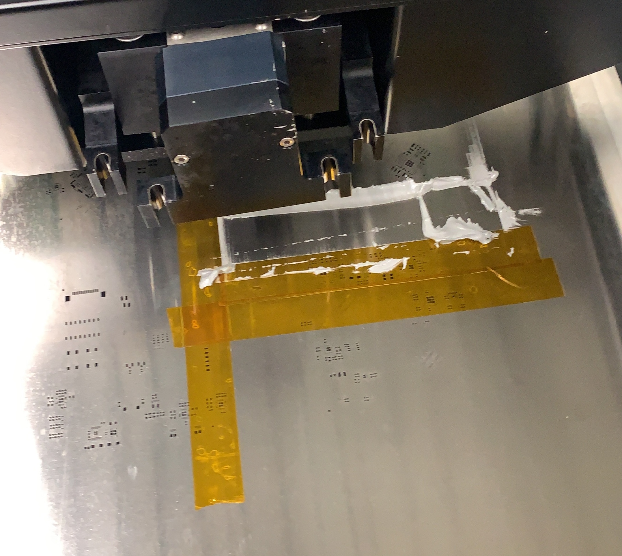 This process can be done by hand using a credit card and a bit of skills; However, here we use a past printer. The printer will first clamps the PCB panel against the stencil. Then, the goal is to spread the solder paste slightly beyond the edges of the component pads by hand. The machine then forces the paste through the stencil apertures using its blades.