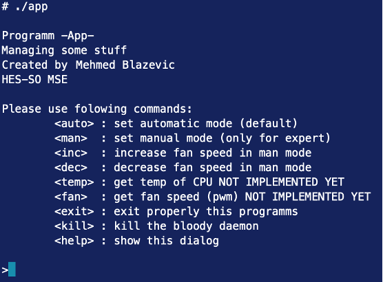 The application is quite simple. When started, it displays the command menu and wait for user to enter a command. Commands are then sent to the daemon via the FIFOs. Here is the launch screen: