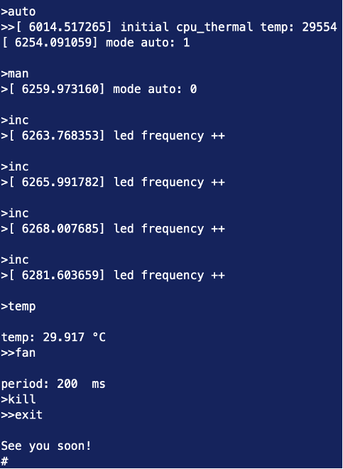 The timestamped logs come from the kernel module. kill command doesn’t provide any output, but it’s possible to see if daemon has stoped with top. The buttons, and the display have also been tested; however, unfortunately, no additional pictures or screenshots are available. For more details, please see sources here: https://github.com/mekiisupertramp/fanless_fancontrol/blob/main/app/app.c
