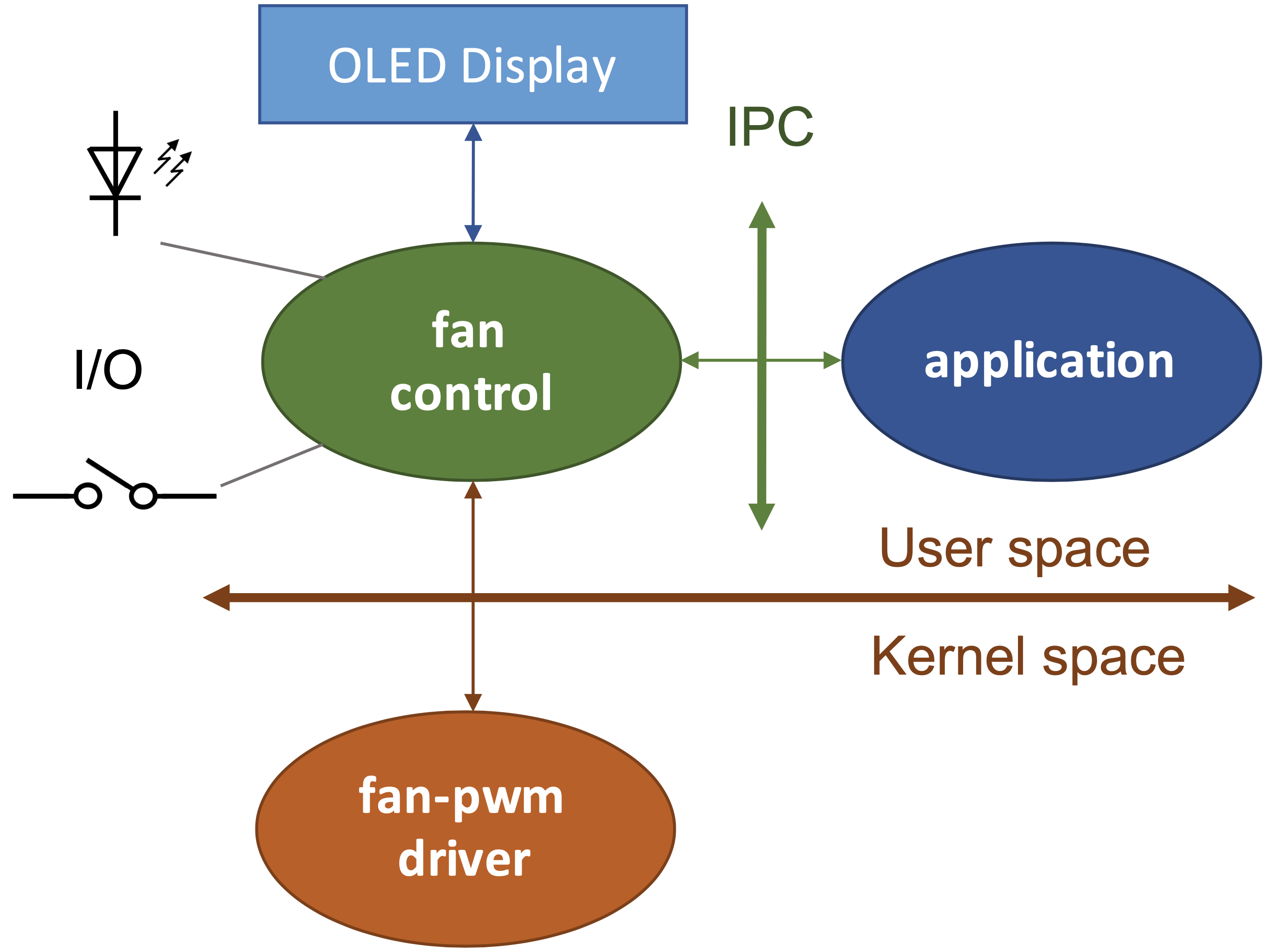 Dissipating the heat generated by the processor and its peripherals is a critical aspect to consider when designing embedded systems. Natural convection cooling is ideal but may not always be sufficient. In such cases, a forced cooling system will complement it and ensure the proper functioning of the equipment. The project focuses on implementing an embedded system under Linux with a specific emphasis on kernel programming, device drivers, and multitasking applications. The goal is to simulate fan speed control based on CPU temperature using an embedded Linux platform. Here is what the system looks like: