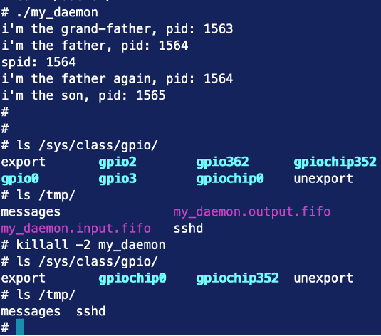This example confirms that the GPIOs and FIFOs are properly instantiated and then correctly destroyed upon termination. For more information, please see the source code here: https://github.com/mekiisupertramp/fanless_fancontrol/blob/main/daemon/my_deamon.c