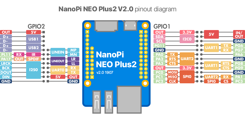 For this project, the NanoPi NEO Plus2 was used with it’s NanoHat OLED display. This board is based on an Alwinner ARM SOC with following features: