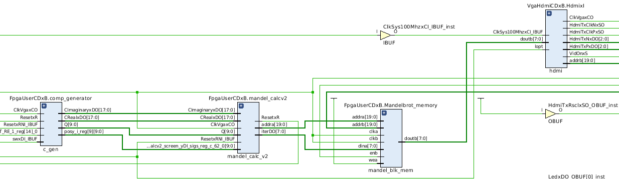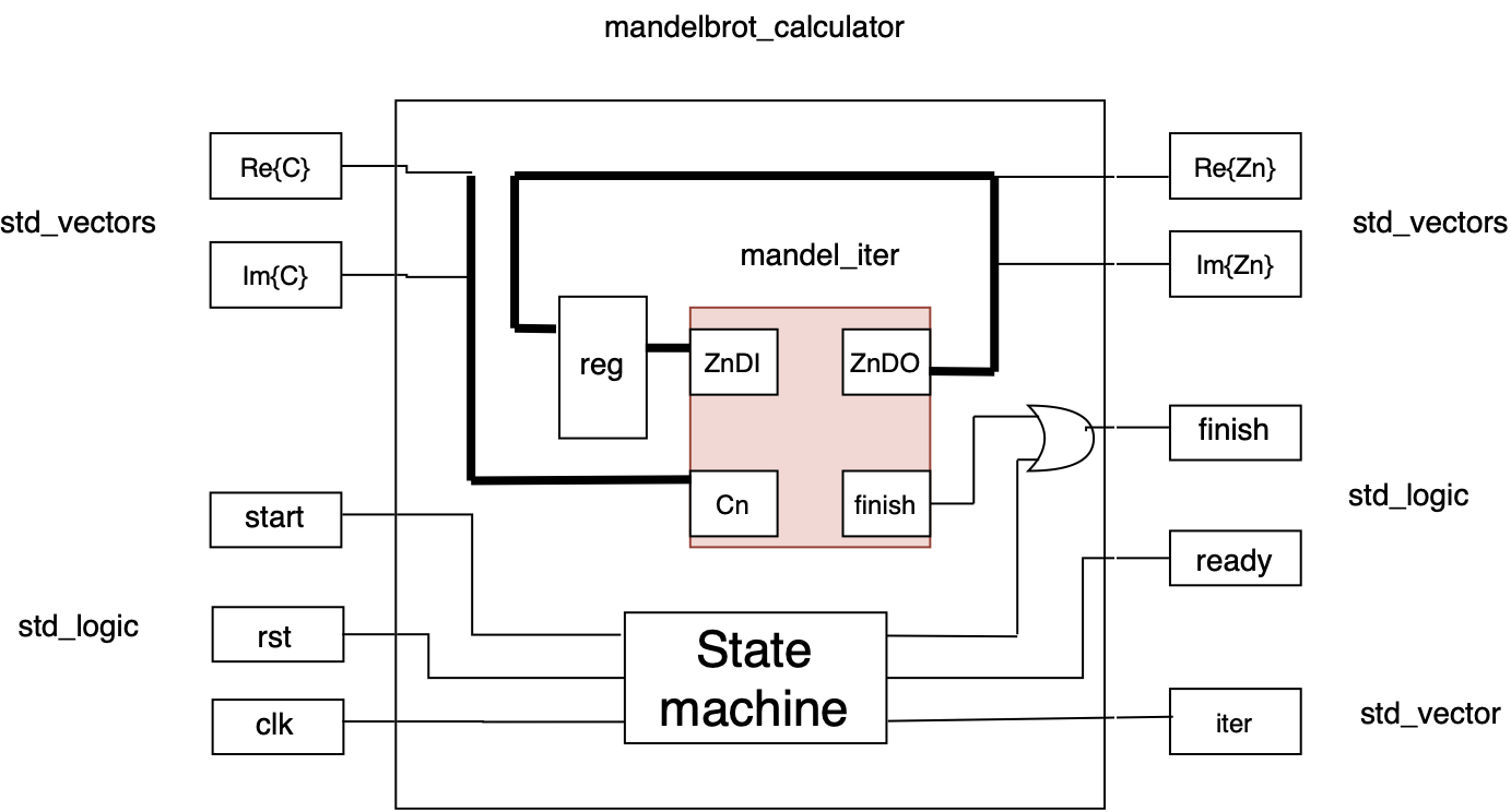 Two blocks are described in VHDL. The lowest level is mandel_iter, which contains only the raw calculation. The next level up is mandelbrot_calculator, which includes elements for inputting data for the calculation. It also contains control elements, such as a state machine.