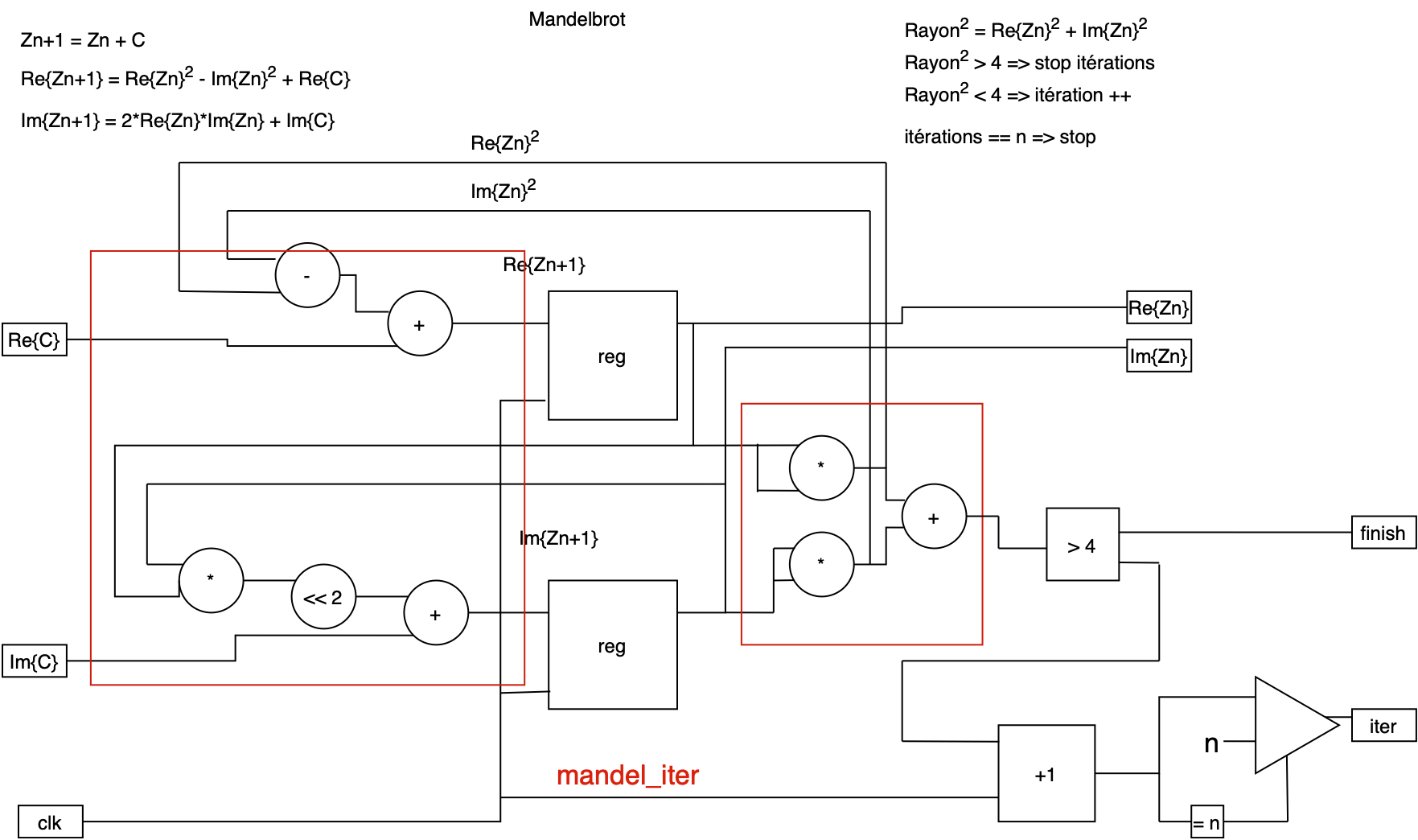 Each step can be done in a combinatorial manner, with the registers serving only to store the current state of the calculation. For a clearer understanding of how the Mandelbrot calculation is performed, below is a block diagram outlining its various components: