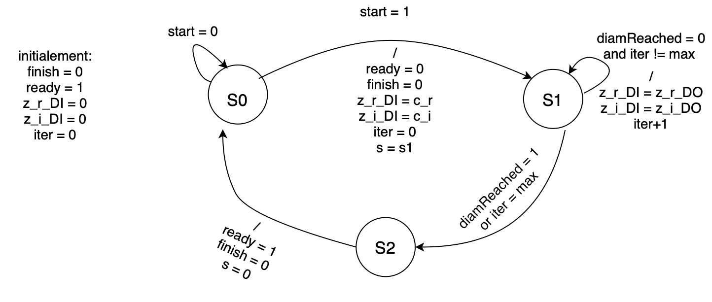 The state machine manages Mandelbrot calculator’s logic, and status signals. State S1 will repeat until it reaches the maximum number of iteration or the maximum diameter. A testbench was made to ensure that the design is working well, and then a full system block diagram: