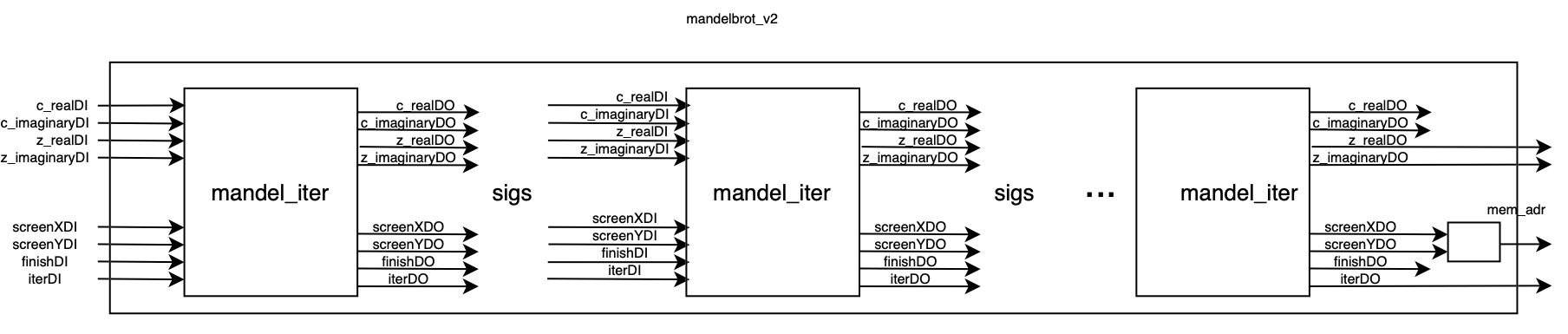 The mandel_iter circuits were chained together and interconnected using signals. Screen position, completion, and iteration signals were added. The screen position, provided by c_gen, is transmitted from block to block, along with the initial complex values. This allows each calculation to be passed sequentially through the blocks.
