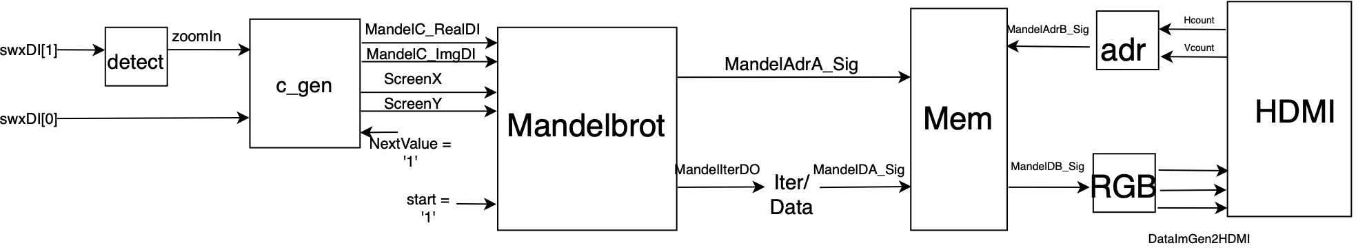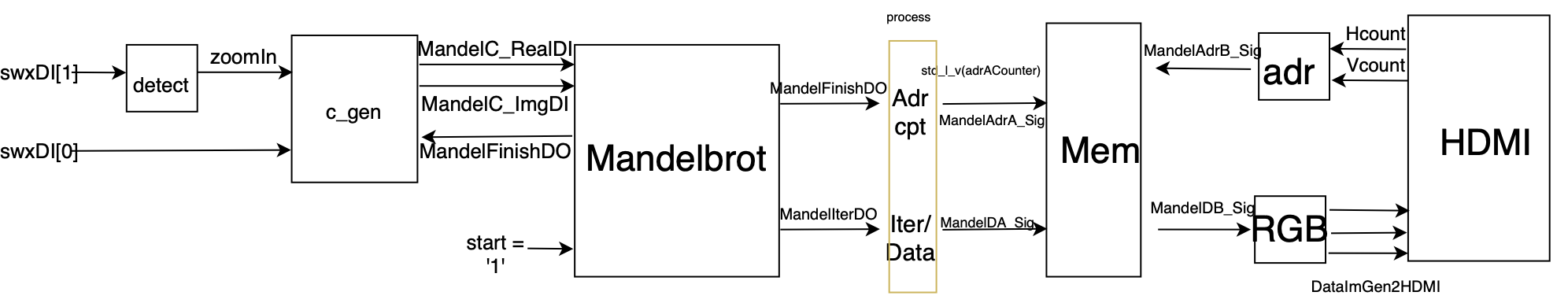 The switch swxDI[0] enables a zoom out, restoring the original Mandelbrot image. When swxDI[1] is pressed (triggered on rising edge), the zoomIn signal is toggled, initiating a zoom animation. This animation is controlled by a process that generates a signal at the zoomIn input of c_gen.