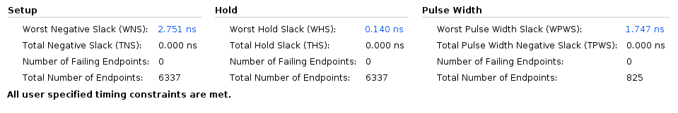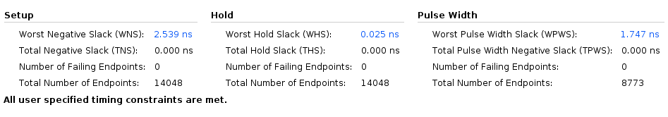Above are the two timing Worst Negative Slack and Worst Hold Slack. These two ensure that the system operates correctly and on time: